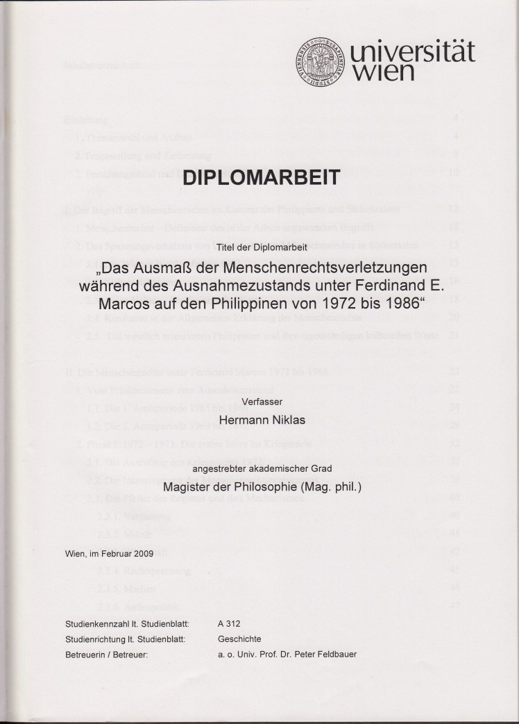Das Ausmaß der Menschenrechtsverletzungen während des Ausnahmezustands unter Ferdinand E. Marcos auf den Philippinen von 1972 bis 1986, Diplomarbeit, Universität Wien, 2009.