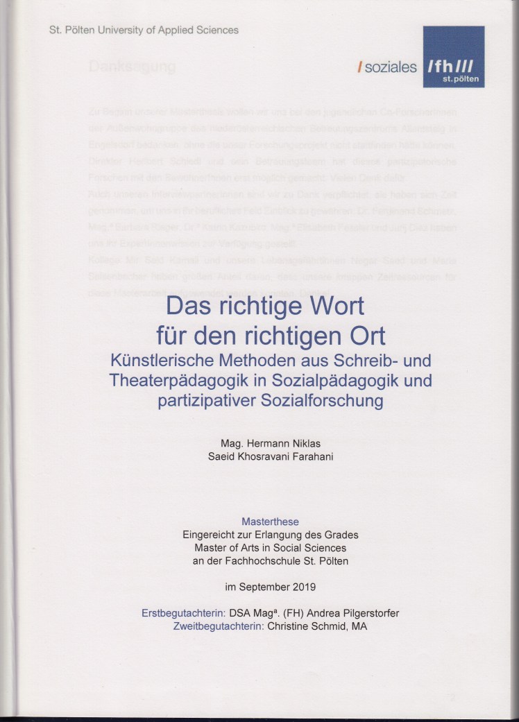 Das richtige Wort für den richtigen Ort ist der passende Titel für die Masterthesis, die ich gemeinsam mit dem Theatermenschen Saeid Khosravani verfasst habe. Wir haben uns an diesen richtigen Ort gefunden und untersucht, ob schreib- und theaterpädagogische Methoden im Feld der Sozialen Arbeit einsetzbar sind. Und kamen zu dem Schluss: Sie sind.