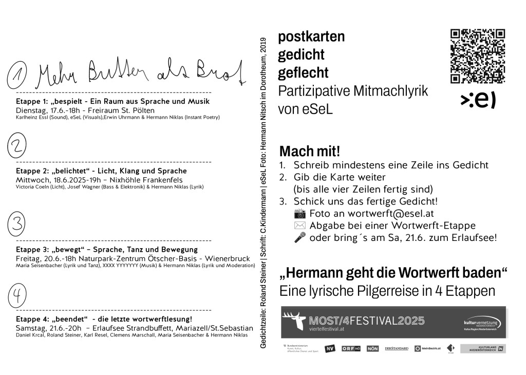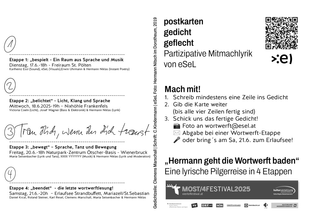 Hermann Niklas, Lyriker und Veranstalter von Literaturprojekten, löst nach zwanzigjährigem Bestehen die Literaturgruppe Wortwerft auf und geht mit ihr baden. Das geschieht in einer literarischen Pilgerreise zu Fuß von Wien bis zum Erlaufsee. Kolleg*innen und Zuhörer*innen steigen entlang der Mariazellerbahn ein und aus, gehen ein Stück des letzten Weges mit. Drei persönliche Abende verbinden Poesie, Musik und visuelle Kunst. Sie werden mit Erwin Uhrmann, Karlheinz Essl und eSeL, Victoria Coeln und Josef Wagner, Maria Seisenbacher und Yvo Kaufmann gestaltet. Diese Künstler*innen waren vor, während oder nach der Wortwerft-Zeit für Hermann Niklas wichtige Begleiter*innen. Die Reise wird mit einem partizipativen „postkartengedichtgeflecht“ von eSeL unterstützt. Am Ende kommt es am Erlaufsee zu einem letzten Wortwerft-Happening: Es wird gebadet!