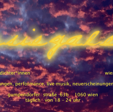 Lesung aus Wetter, Poesiegalerie 2020 Donnerstag 1. Oktober 23.20! Programm Es lesen 40 Autor*innen aus 20 Verlagen ORT: IG Architektur, Gumpendorferstraße 63B, 1060 Wien, täglich 18 – 24 Uhr 1.Tag: Donnerstag 1.Oktober 2020 18:00 – 18:55 POETRY SLAMAnna HaderMarkus Köhle Im Anschluss spricht Peter Clar mit den beiden über ihre Arbeit und das Verhältnis Lyrik und Slam Pause … Mehr Lesung Poesiegalerie 2020